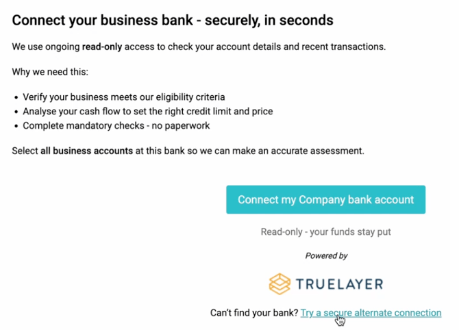 Some banks, such as Anna, Allica or Clydesdale, don’t yet support Open Banking connections through TrueLayer or Yapily. If yours isn’t available through either option, you won’t be able to connect it right now — which means we can’t complete your application just yet.